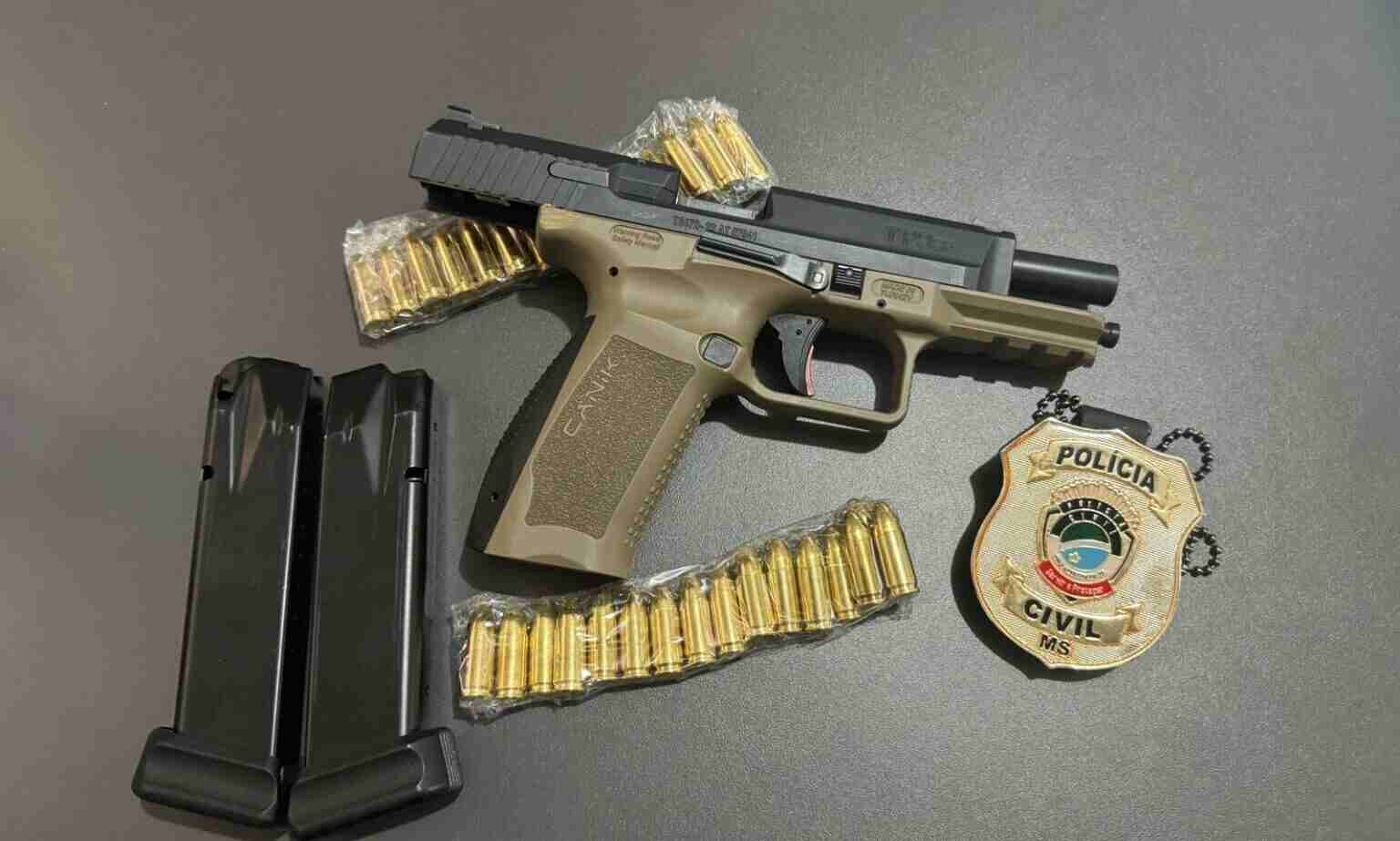 Durante o atendimento da ocorrência, os policiais civis perceberam que o motociclista estava armado com uma pistola Canic, 9 milímetros, de origem Turca .