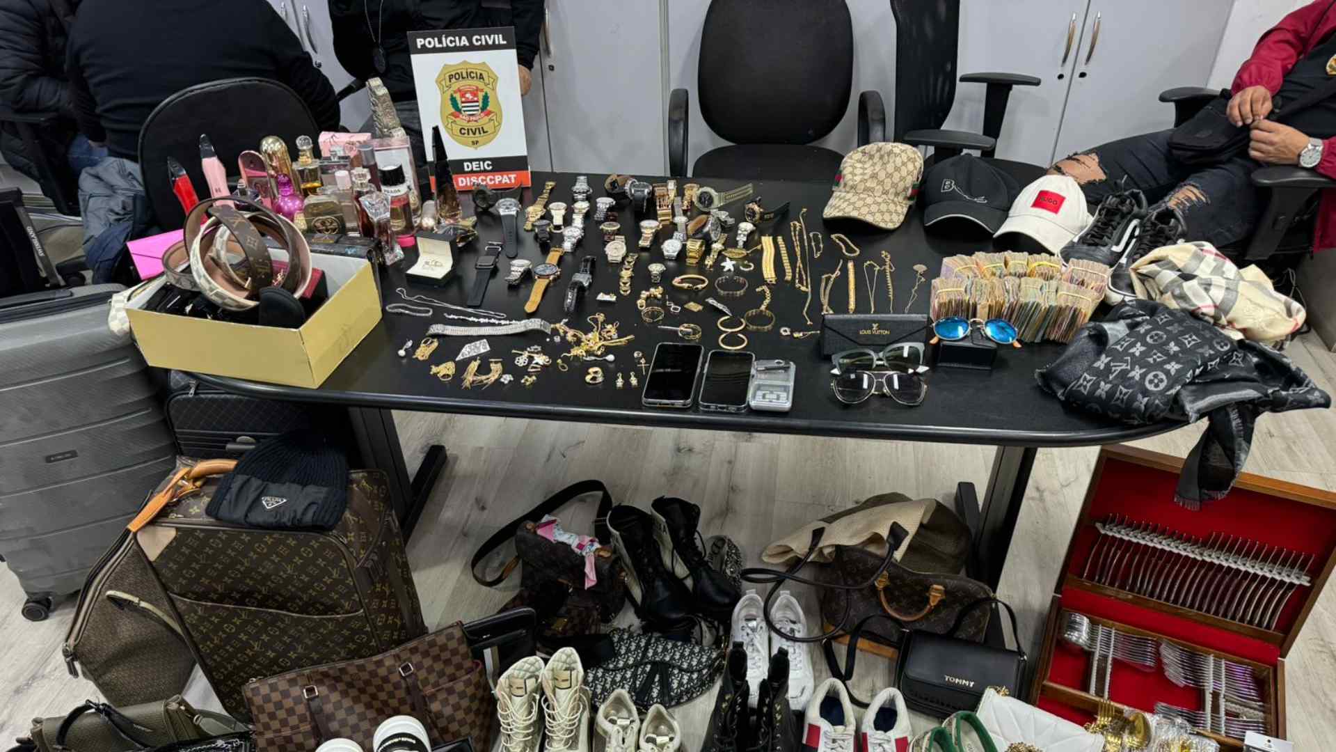 Nos endereços, os policiais civis apreenderam celulares, um notebook, valores em espécie, além de joias, relógios e bolsas de grife.