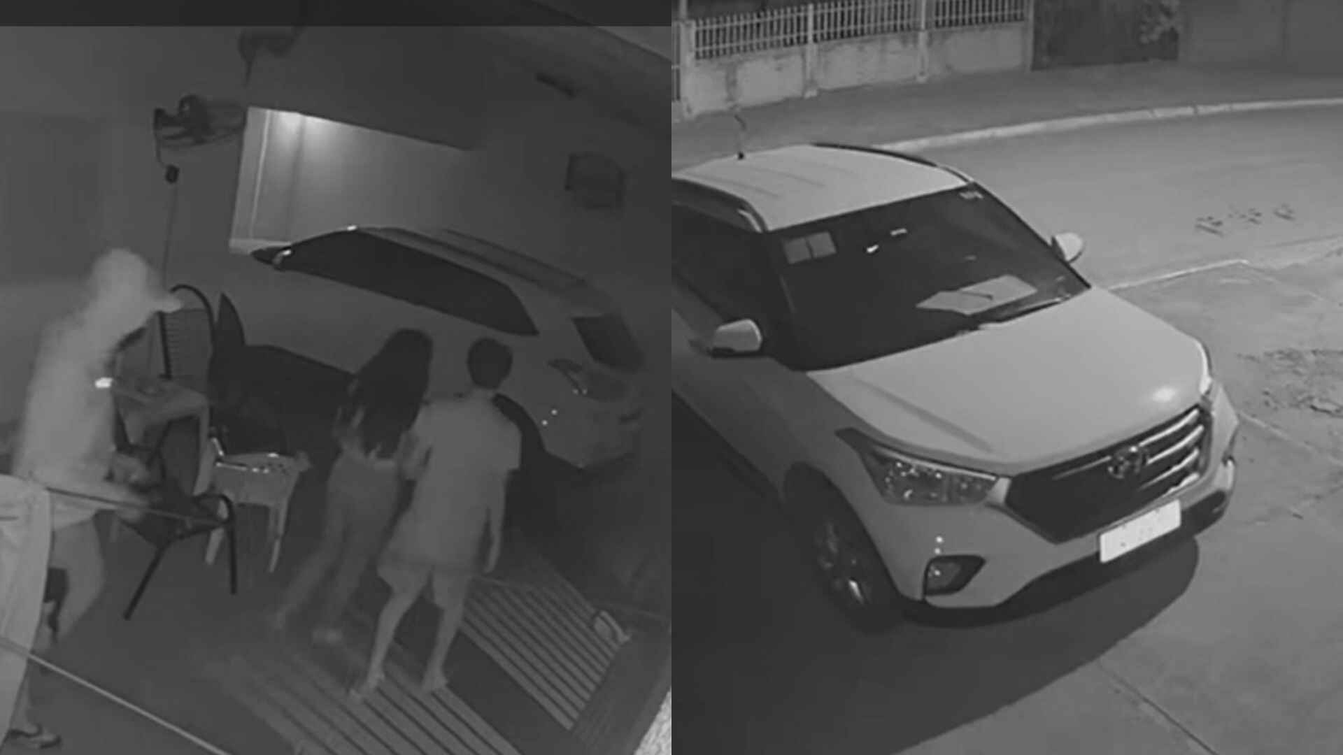 Imagens de câmeras de segurança registraram a ação criminosa desde o momento em que Alberto pulou o muro entrando armado, conduzindo as vítimas até o carro e saindo do imóvel.