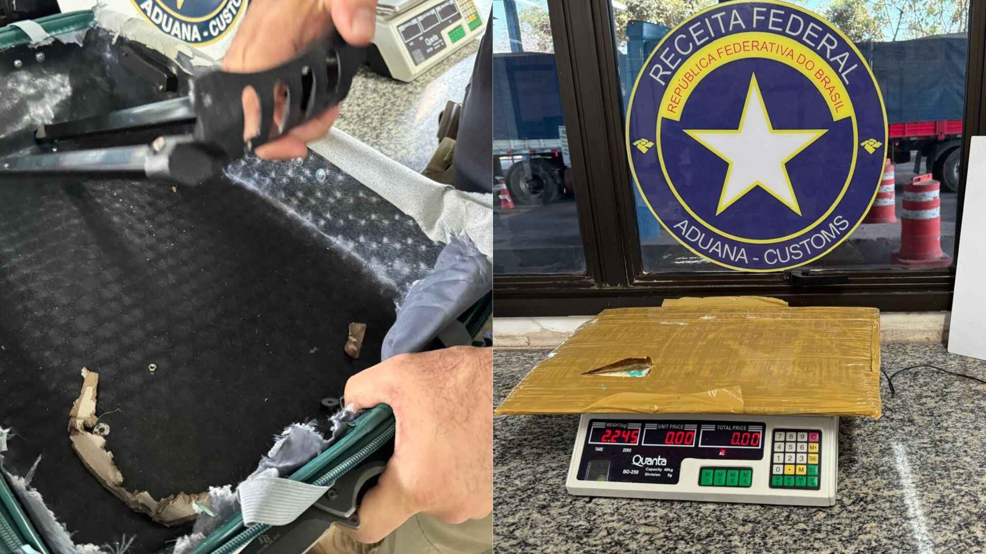 Durante a fiscalização, foram apreendidas 2,5 toneladas de alimentos contrabandeados e vestuário contrafeito, além de 2,245 quilos de substância análoga à pasta base em uma bagagem.