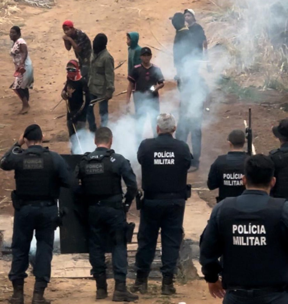Ainda de acordo com a PM, os indígenas teriam ateado fogo na ponte que dá acesso à propriedade para evitar a passagem dos agentes. Ao tentar controlar as chamas, os policiais teriam sido atacados com flechas, facões e pedras. Responderam usando munição não letal (balas de borracha) e escudos contra os indígenas.