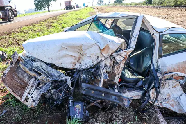 Motorista de um carro de passeio foi socorrido em estado grave após bater em uma carreta, na BR-262, região do Indubrasil, em Campo Grande. O carro foi lançado às margens da estrada e teve a frente totalmente destruída. O acidente foi registrado às 5h45 desta terça-feira (29).