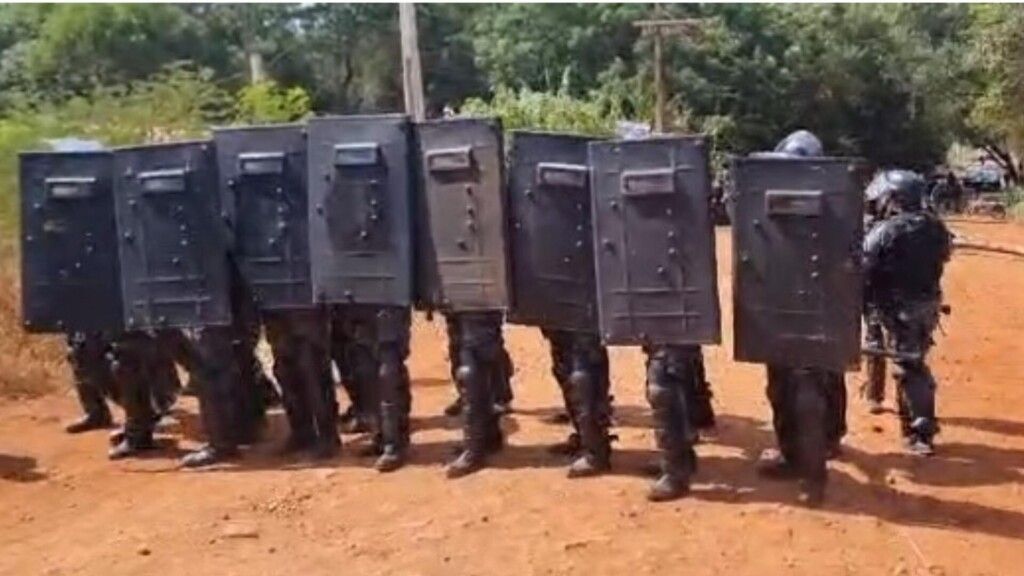 Vídeos registrados por moradores das aldeias mostram os policiais se aproximando da reserva, enquanto os indígenas tentam se proteger e argumentar sobre reivindicação.