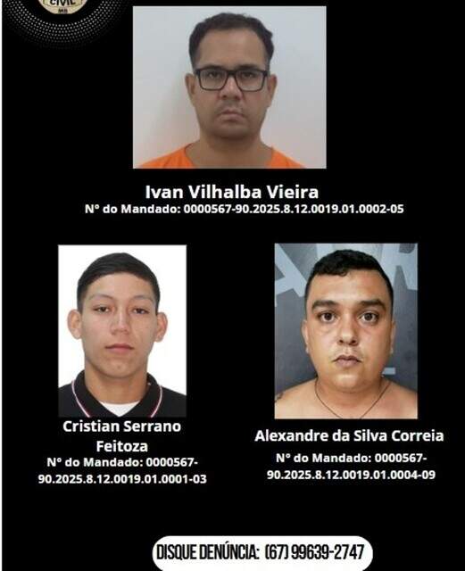 A polícia também divulgou nomes e fotos de três homens envolvidos no crime: Ivan Vilhalba Vieira, apontado como mandante do assassinato, e os pistoleiros Cristian Serrano Feitosa e Alexandre da Silva Correia. Os três estão com prisão preventiva decretada e teriam fugido para o lado paraguaio da fronteira.