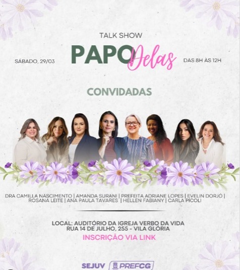 O talk show contará com a presença de autoridades e profissionais de destaque, como a prefeita Adriane Lopes, a vice-prefeita Dra. Camilla Nascimento, a secretária municipal de Saúde Dra. Rosana Leite, a psicóloga Evelin Dorjó, a empresária Amanda Surani, a personal organizer Carla Pícoli, a empresária Hellen Fabiany e a diretora Ana Paula Tavares. Elas compartilharão suas histórias, vivências e conhecimentos, promovendo um espaço de escuta e inspiração para todas as presentes.