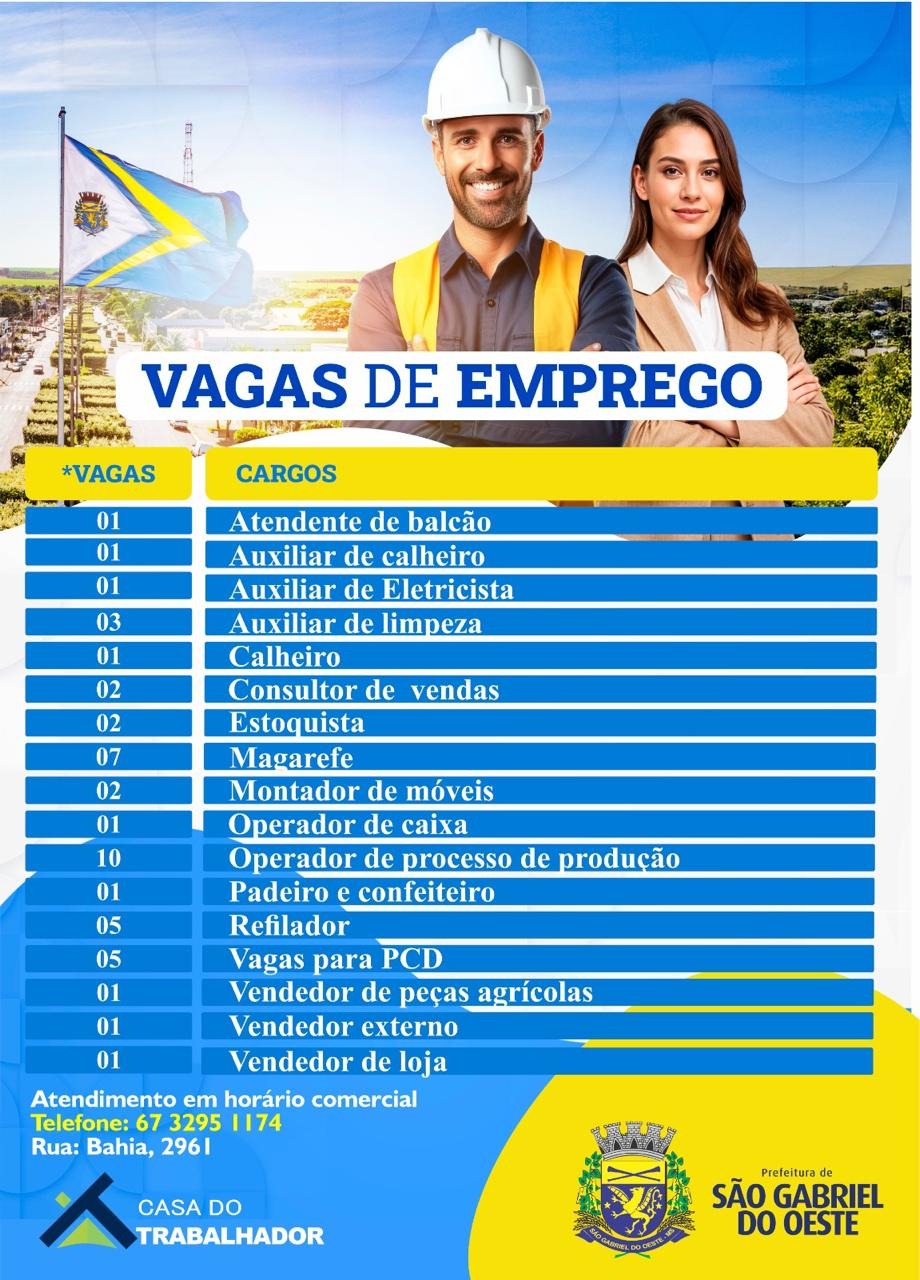 A Prefeitura Municipal de São Gabriel do Oeste, através da Casa do Trabalhador, está divulgando uma variedade de vagas de emprego. Essas oportunidades abrangem diferentes áreas e níveis de experiência, proporcionando uma série de opções para os interessados em ingressar ou retornar ao mercado de trabalho.