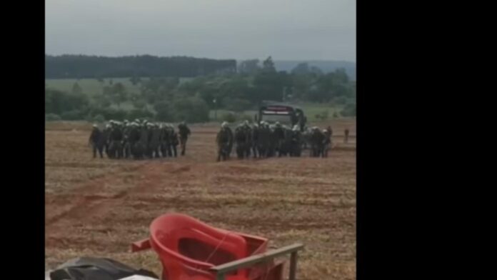 Imagens do Portal Maranata News mostram os policiais já na fazenda onde estão os acampados. É possível ver fogo em algumas partes da propriedade.