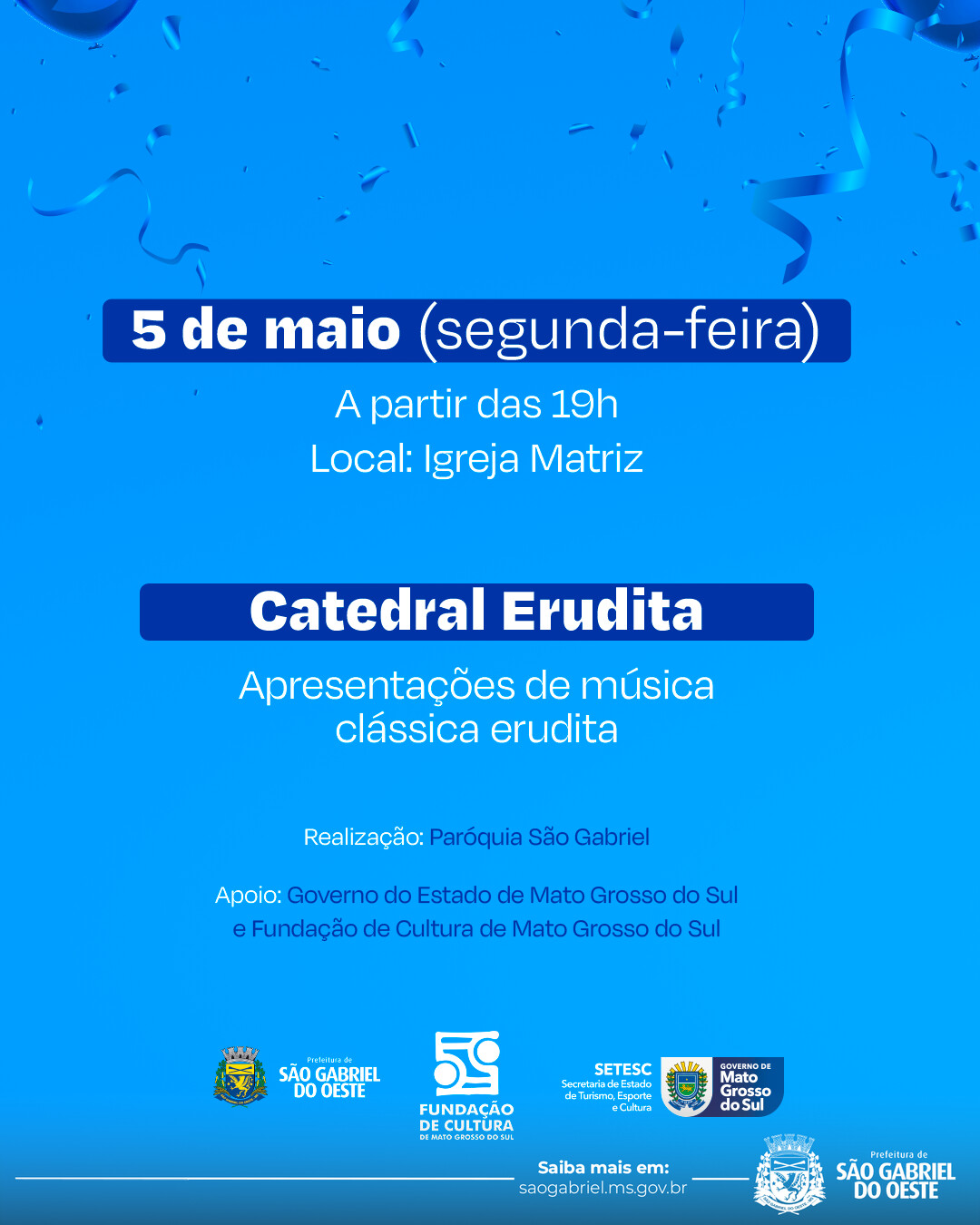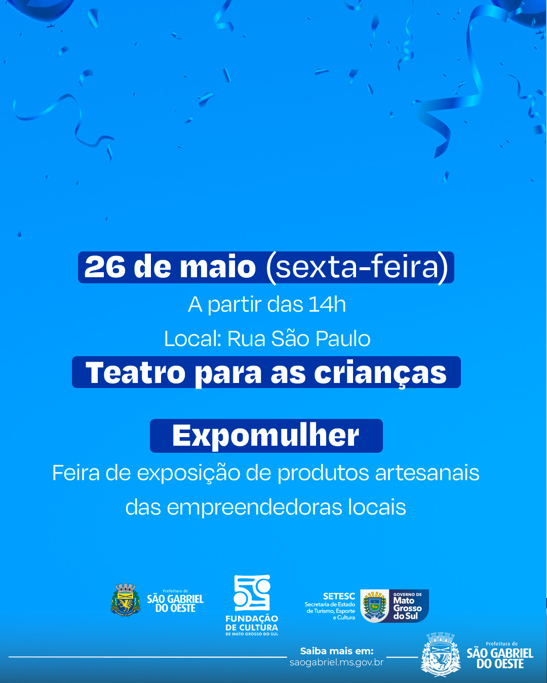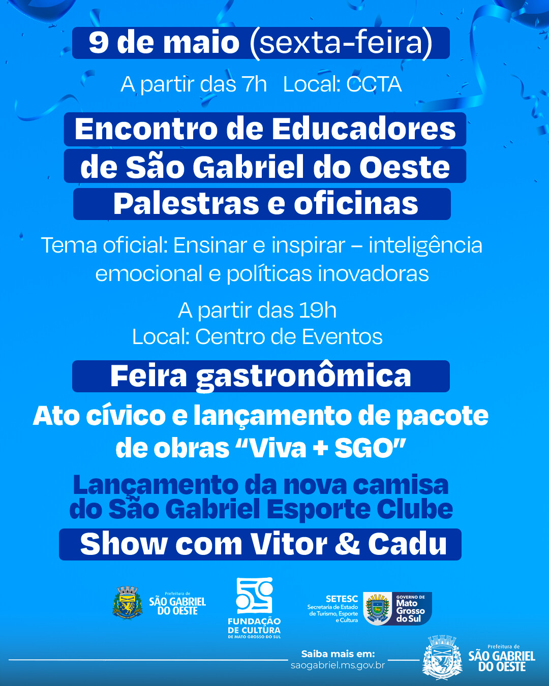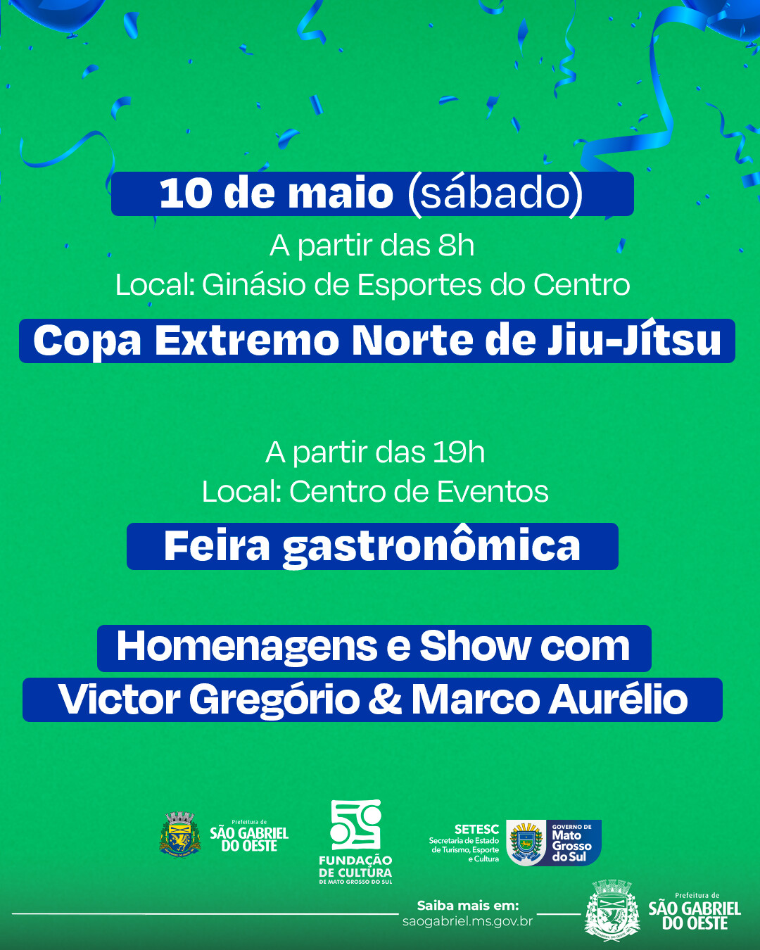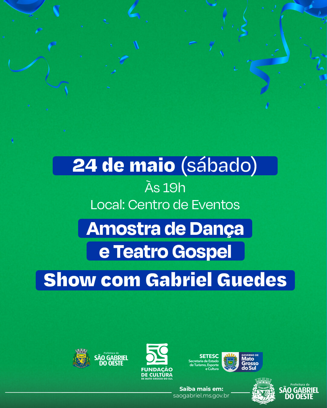 A Prefeitura Municipal convida toda a população para participar da programação comemorativa dos 45 anos de São Gabriel do Oeste.