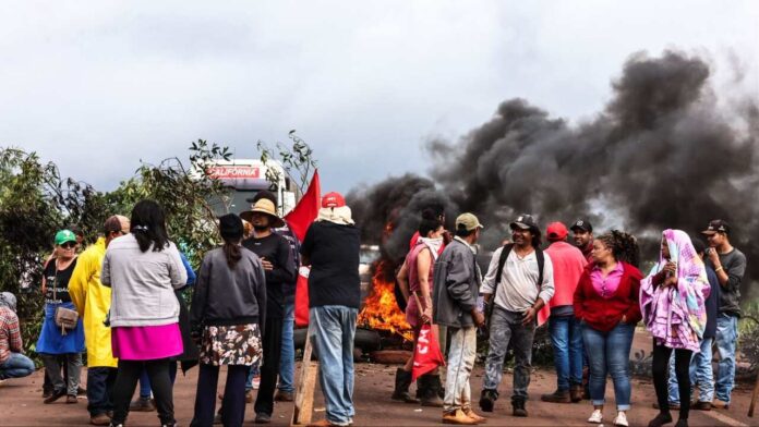 Cerca de 600 famílias do MTS (Movimento dos Trabalhadores Rurais Sem Terra) bloqueiam a BR-060, em Sidrolândia, próximo ao trecho conhecido como trevo do “Capão Seco”, em protesto por reforma agrária, na manhã desta segunda-feira (28). O congestionamento ultrapassa 15 km, após a interdição em ambos sentidos da rodovia.