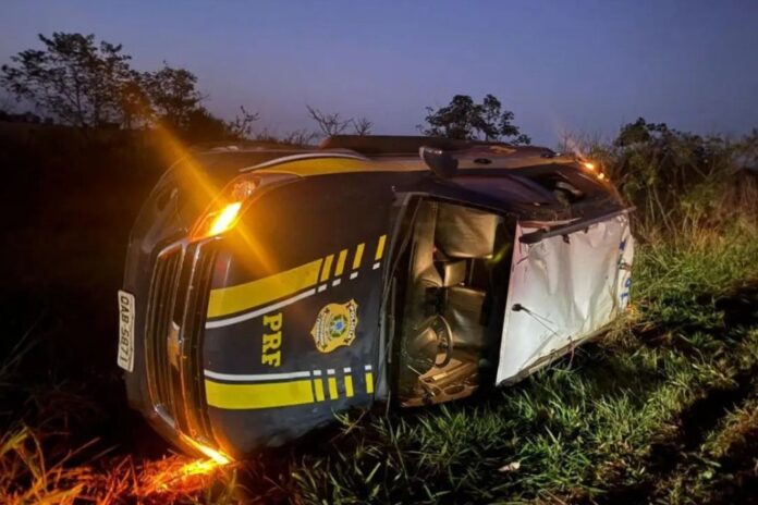 Uma viatura da Polícia Rodoviária Federal (PRF) capotou no início da noite de quinta-feira (21), na BR-267, em Maracaju (MS), durante uma perseguição. O acidente aconteceu quando os agentes tentaram desviar de outra colisão na pista.
