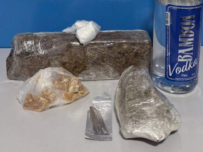 Durante a revista, a mochila da adolescente foi inspecionada e dentro de uma caixa de sapatos foram encontradas as seguintes substâncias: