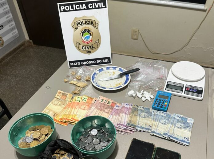 Durante a ação, foram apreendidos entorpecentes como cocaína e pasta base de cocaína, já fracionadas em porções para comercialização. Também foram encontrados e recolhidos 80 sacos plásticos do tipo “zip”, comumente utilizados no acondicionamento de drogas, uma máquina de cartão de crédito, quatro aparelhos celulares e R$ 801,00 em espécie, em cédulas e moedas fracionadas, típico da mercancia ilícita do entorpecente.