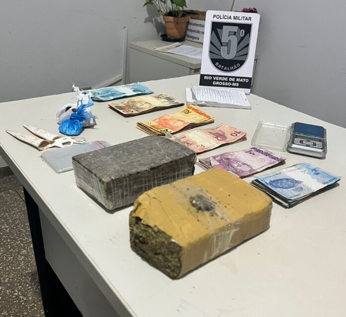 Durante buscas no imóvel, os policiais localizaram aproximadamente 954 gramas de maconha, 9 gramas de cocaína, uma balança de precisão, R$ 1.718,00 em dinheiro, além de embalagens e um caderno com anotações típicas do tráfico de drogas.