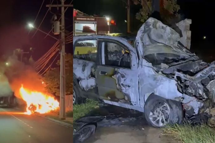 Um acidente na madrugada deste domingo (11) deixou duas pessoas feridas na Avenida dos Cafezais, na região do bairro Jardim Centro-Oeste, em Campo Grande. O carro em que as vítimas estavam bateu em um muro e, logo depois, pegou fogo.