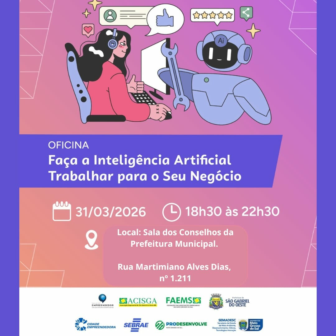Empresários, empreendedores e profissionais de São Gabriel do Oeste terão a oportunidade de conhecer, na prática, como a Inteligência Artificial (IA) pode ser aplicada para melhorar processos, aumentar produtividade e gerar novos resultados nos negócios. No dia 31 de março, a Prefeitura Municipal promove a oficina “Faça a Inteligência Artificial Trabalhar para o Seu Negócio”, que será realizada das 18h30 às 22h30, na Sala dos Conselhos da Prefeitura Municipal.