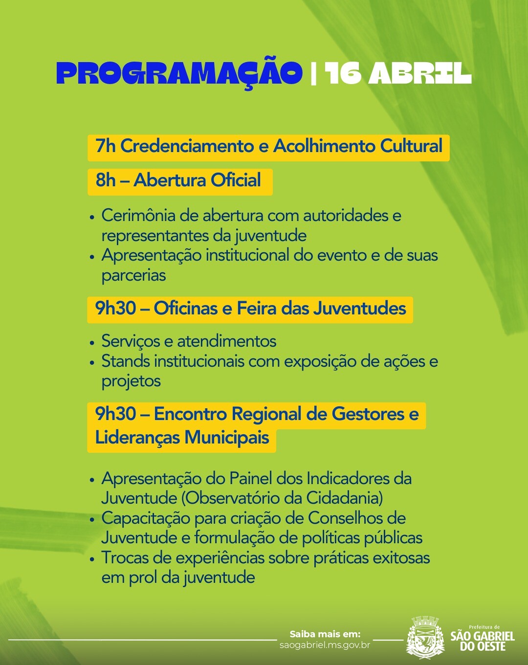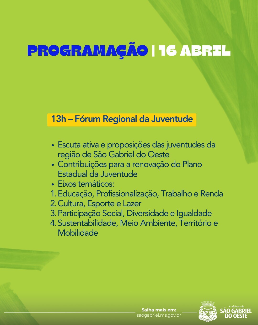 “Convidamos todos os jovens de São Gabriel do Oeste e da região para participarem desse momento. O Circuito é um espaço de escuta, aprendizado e construção de oportunidades. É a chance de os jovens serem protagonistas e contribuírem diretamente com ideias e propostas para o futuro”, destacou.